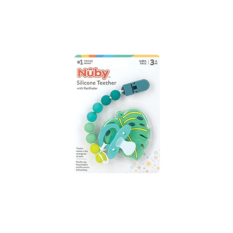 Nuby All Silicone Teether with Bonus Silicone Pacifinder with Clip - 3+ Months, 1pk,Monstera Leaf