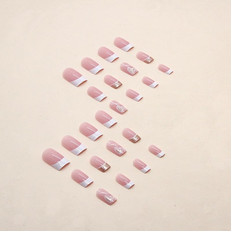 Nude Glitter White Heart Press on Nails Fake Nails Medium Short Coffin Square,Aqinmony with Designs False Nails Short Square, French Tip Full Cover Glue on Nails, Glossy Acrylic Thick Stick on Nails For Women 24Pcs CW41