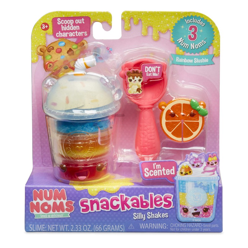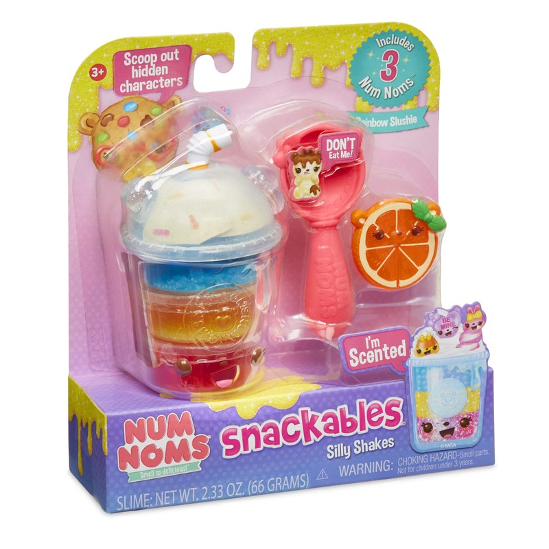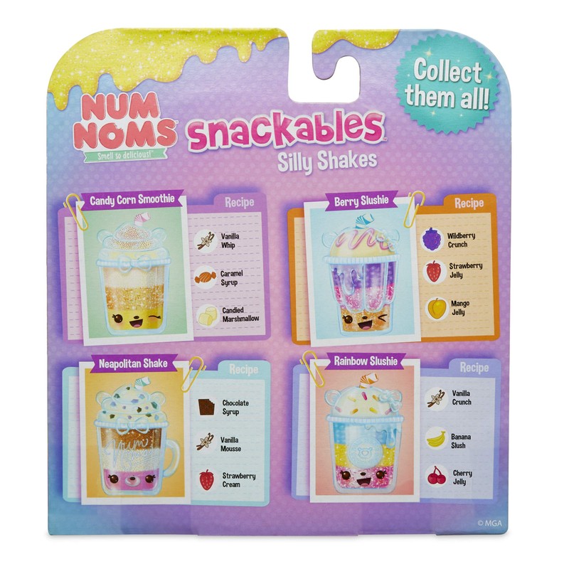 now you can play with your "drinks" Too with Num Noms silly shakes! Dig into the scented silly shakes slime to find hidden Num Noms Inside! Which Num Noms stackable will you get? It's a surprise! Silly shakes slime comes in so many different textures and scents. Mix and match layers to create the ultimate silly shake! Collect them all!