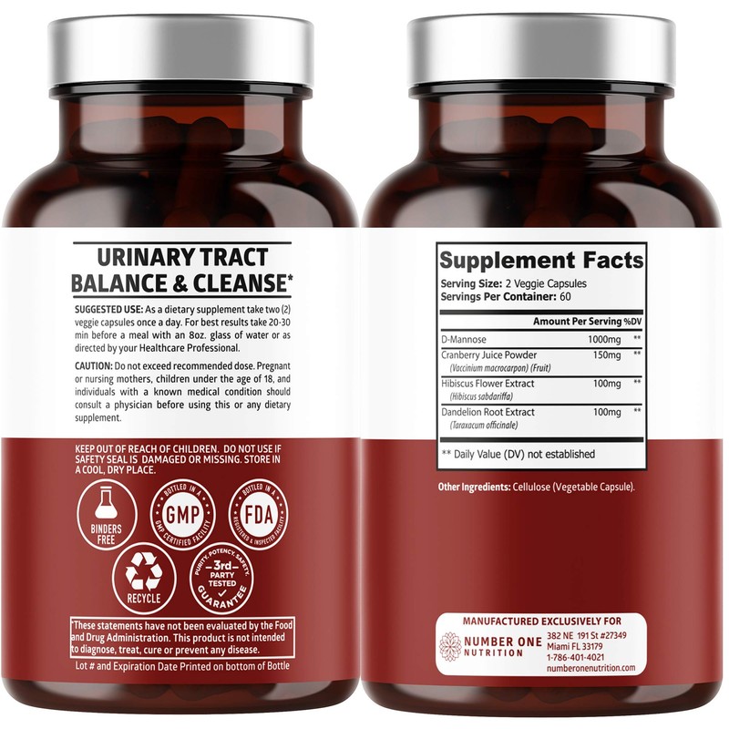 Number One Nutrition Premium D Mannose with Cranberry and Hibiscus [Max Strength, 1350mg] 120 Capsules