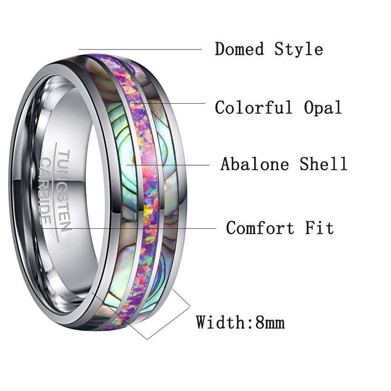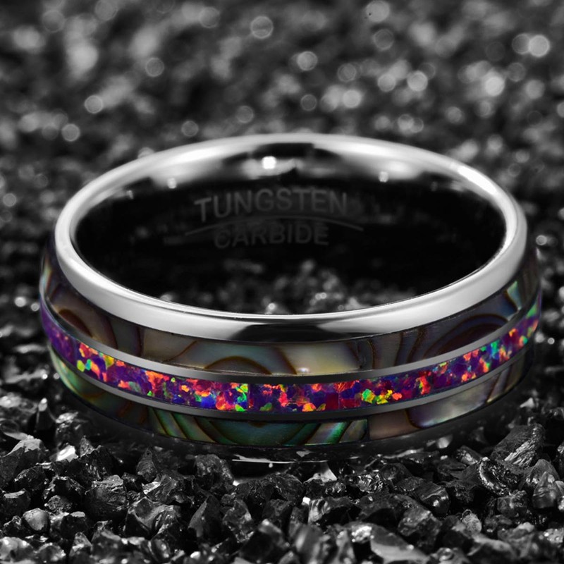 This purple fire Opal and abalone shell tungsten ring us absolutely a handicraft.This ring is for couples seeking a wedding band that's tasteful, unique, and timeless.