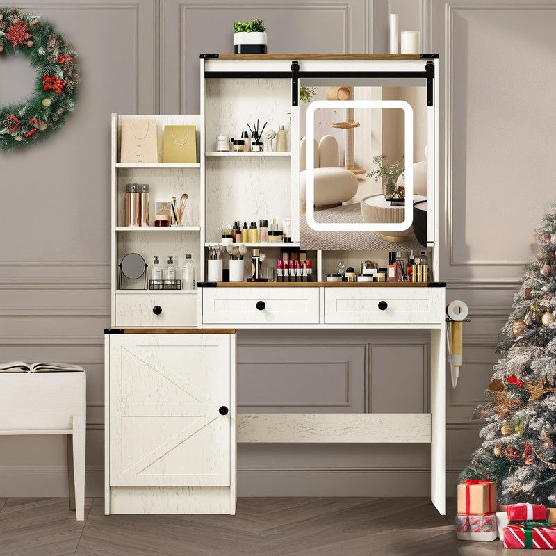 - 🎀【Dressing table with charging station】This farmhouse dressing table with light has 2 standard sockets and 2 USB ports, which makes it more convenient to connect your hair dryer and curling iron, and can also charge your mobile phone, tablet or other mobile devices, which is more convenient for daily use. In addition, we have added a metal shelf to the side of this cute dressing table where you can place a hairdryer or cup for easy access and use, and you can place it on either side as required.