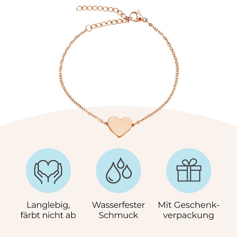 - Our quality - The heart bracelet is available in silver stainless steel or with 18 K gold plating in rose gold. The jewellery is very strong, durable and does not fade.