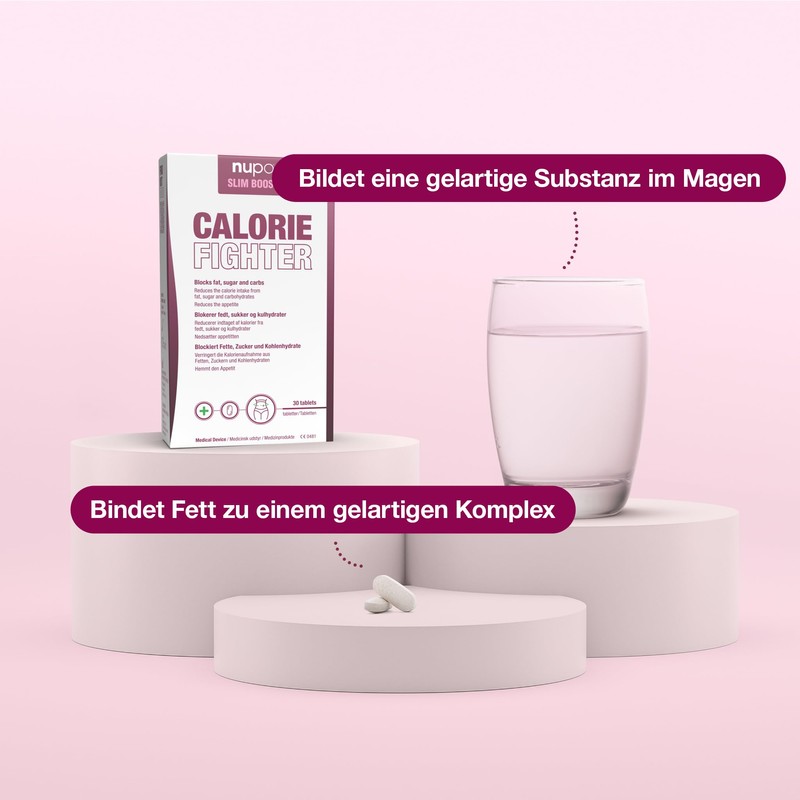 Nupo Slim Boost Calorie Fighter is a CE certified solution specifically designed to treat overweight and obesity. This clinically proven formula works through a dual mechanism of action that reduces the absorption of fat, sugar and carbohydrates from your diet. How it works: the active ingredients in the Calorie Fighter work together to achieve a unique blocking effect: Omtec 50 is a natural fibre with high lipid binding capacity that helps neutralise calories from high-fat foods. Omtec XS extract inhibits the starch-digesting enzyme pancreatic alpha-amylase and interrupts carbohydrate digestion. Together they form gellike substance In the stomach, which binds fats, carbohydrates and sugar in non-soluble form. These bound nutrients are not absorbed into the metabolic cycle, but are excreted undigested. Recommended use: only for adults aged 18 and over. Take 2 tablets with at least one glass of water (250 ml) one hour before each main meal (breakfast, lunch, dinner). For best results, take a multivitamin prep daily. parparparparparparat preferably before bedtime). Do not use for more than 30 days in a treatment period; the treatment can be resumed after 4 days. Each pack contains 30 tablets, which are sufficient for a 5-day treatment if used as intended. Important safety information: consult your doctor before long-term use. Not suitable for people with gastrointestinal diseases, people who take blood thinners, pregnant or lactating women or people with a BMI below 18.5. Oral medication should be taken 1 hour before or 4 hours after using Calorie Fighter. Read the enclosed before use. Instructions for use of the use of Nupo is Scandinavia's leading brand for weight management with over 40 years of experience in nutrition science.