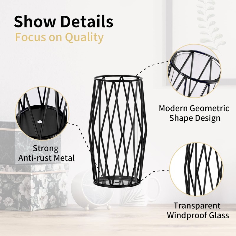 Nuptio Portavelas de vidrio para velas de pilar, portavelas de pilar negro, soporte geométrico de metal para velas de huracán, jarrón de flores para oficina, comedor, sala de estar, bar, cafetería