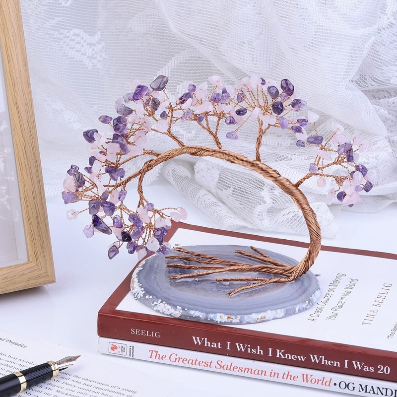 - Copper Wire Crystal Stone Tree: Bonsai tree has agate slice as bases, the tree is hand-twisted into curved trunks and branches with glittering brass wires, and hundreds of delicate and smooth irregular tumbled stones are selected as leaves. The unique appearance design is ingenious and vivid, which is both pleasing to the eye and healing to the soul.