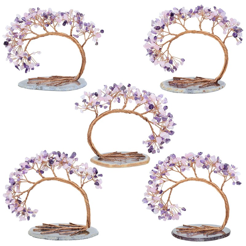 Nupuyai 4.5-5.2" Copper Wire Healing Crystal Money Tree for Good Luck Agate Slice Base Bonsai Crystal Stone Tree Decor for Home Office, Amethyst & Rose Quartz