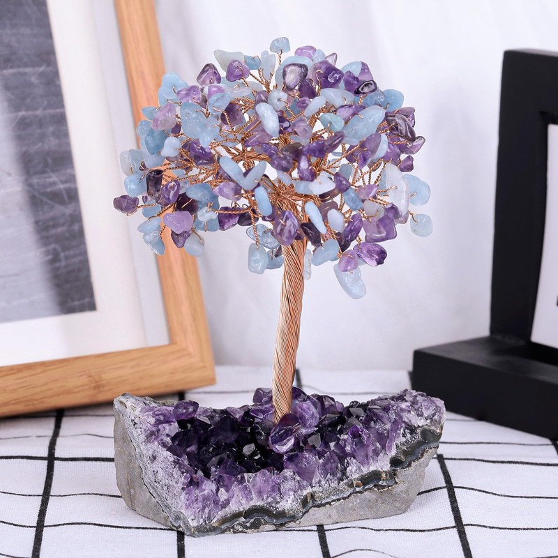 - Handmade stone tree: tree decor with chip stones amethyst & aquamarine as leaves, a natural amethyst geode as the base and copper wire as branches and trunk. The chip stones are well polished and have bright colours, visually appealing to place on the table. The branches will be folded when packed so you can rearrange this beautiful handicraft.