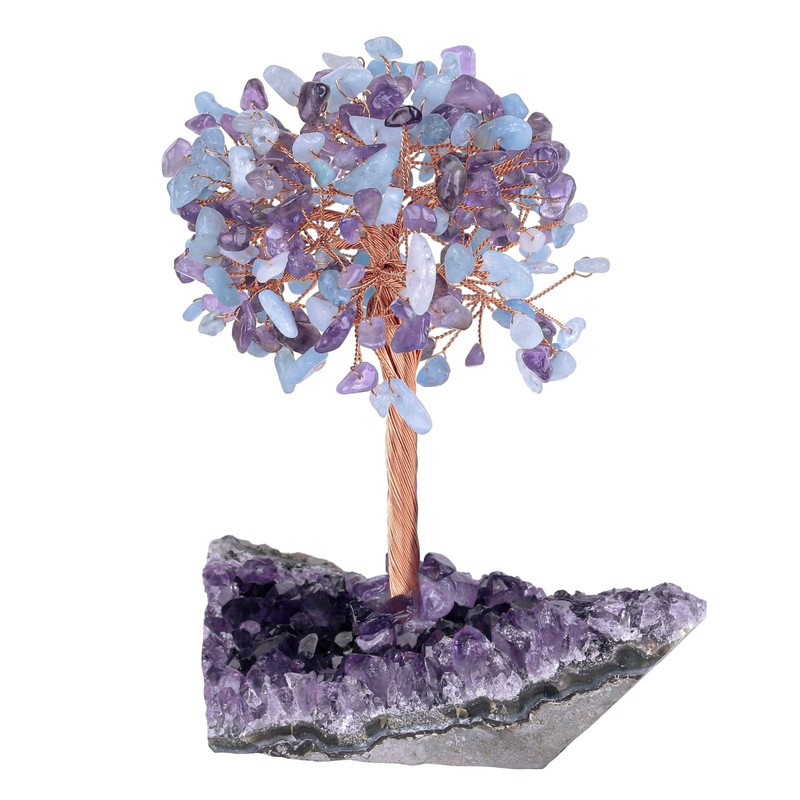 Nupuyai Amethyst & Aquamarine Tree of Life Natural Geode Base Stone Feng Shui Crystal Tree Handmade for Indoor Decoration and Reiki Chakra