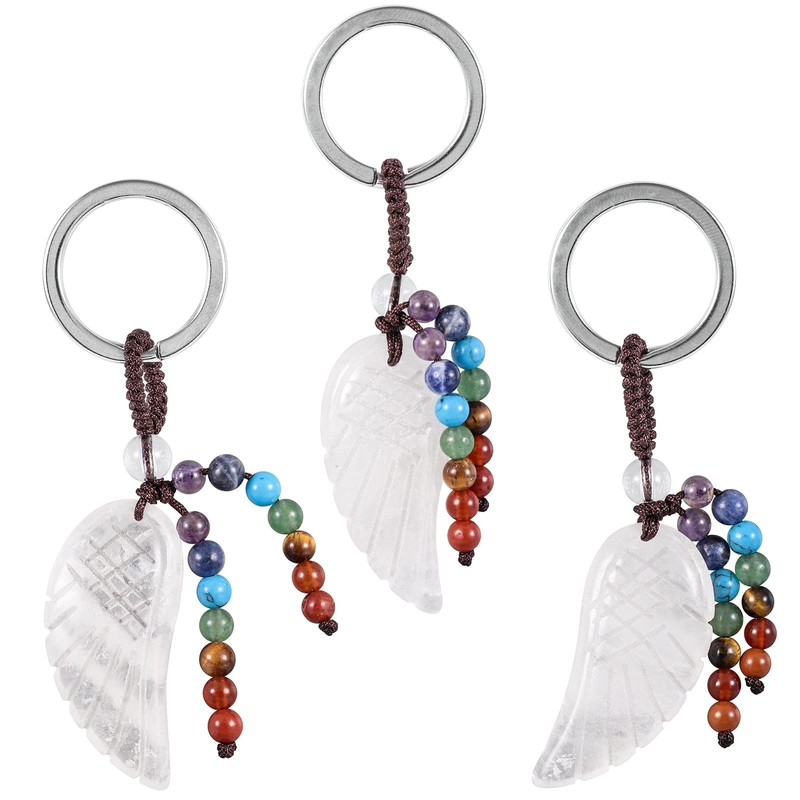 Size: total length: 3-3.15 inch; Gemstone wing: 33-37 mm (L), 16-18 mm (W), 6-9 mm (D); Round crystal bead: 6 mm diameter; 14 pieces x 7 chakra gemstone beads: 4 mm diameter; Weight approx. 12-20g; Key ring: diameter 25mm.