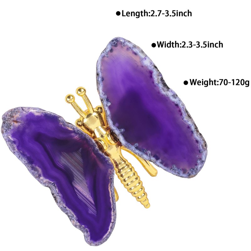 - Size Details: Butterfly crystal statue: length: 2.75-3.54"(7-9cm), width: 2.36-3.54"(6-9cm), height: 0.78-1.37"(2-3.5cm). Crystal agate slice: 2.75-3.54"(7-9cm) long, 1.14-1.33"(2.9-3.4cm) wide, 0.15-0.27"(4-7mm) thick. Weight is about 70-120g/pc. Two butterfly statues will come in a black gift box and come with a pink satin gift bag for easy transportation and storage.