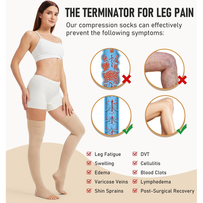 Enjoy comfort and support with our compression stockings for women and men, designed to improve leg health. They enhance blood flow, ease tired and aching legs, and are perfect for managing varicose veins, diabetes, long flights, and swelling. Key Features: Graduated Compression Technology: medical 20-30 mmHg compression stockings for women and men are crafted with a design that provides gentle pressure at the ankle, which gradually decreases as it moves up the leg. This innovative feature enhances healthy blood circulation. Premium Quality Material: These thigh-high compression socks for women and men, made from breathable, elastic fibers. Stylish Design: Our thigh-high compression stockings for men and women blend classic colors, styles, and functionality, letting you look good while caring for your legs. Strong Build: Women's medical compression stockings are crafted from high-quality materials and expert stitching, ensuring they maintain their shape and compression level through numerous washes. Who Can Benefit from open-toe compression stockings for women and men: Professionals: Ideal for those who stand or sit for long periods, such as nurses, teachers, retail staff, and office workers. Pregnant Women: Provides essential support to expecting mothers, helping reduce swelling and discomfort during pregnancy. Athletes and Fitness Enthusiasts: Perfect for runners and active individuals looking to enhance performance and recovery. Post-Surgery Patients: Recommended for those recovering from surgeries that may impact leg circulation. Usage: For best results, wear thigh-high compression socks in the morning while in bed. Ensure a snug fit for optimal compression. Our design fits various leg shapes and sizes."". Step into Comfort and Confidence! Choose our leg compression sleeve for superior support and comfort—your legs will thank you! Order now and enjoy a healthier, more active lifestyle