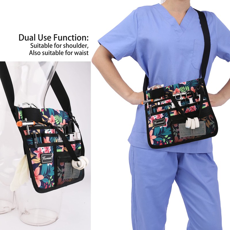 - 2.The nurse bag has 13 pockets,one of which is designed to hang tape or other tools.It can hold markers,thermometers,pen lights and flushing syringes.Place your phone,iPad, gloves,stethoscope, medicine, scissors,bandages,cotton swabs,rags,hand sanitizer,and more.The back pocket is designed with side zips for convenient storage and access.There is a woven label inside the zipper on the back of the bag.The name is easy to distinguish.