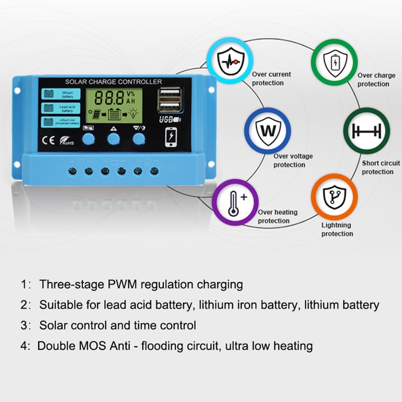 - Advanced Solar Charge Controller: Featuring an updated industrial microcontroller, our 30A solar charge controller efficiently manages the working status of solar panels and batteries in small solar systems automatically.