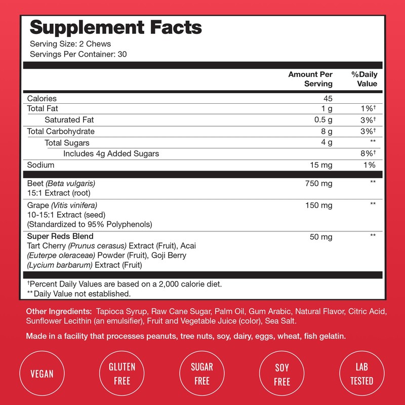 • Super Reds Blend - Our proprietary antioxidant-rich blend features Pomegranate Extract, Acai Berry Extract, and Acerola Cherry Extract that work in harmony to amplify the effects of our beet chews.