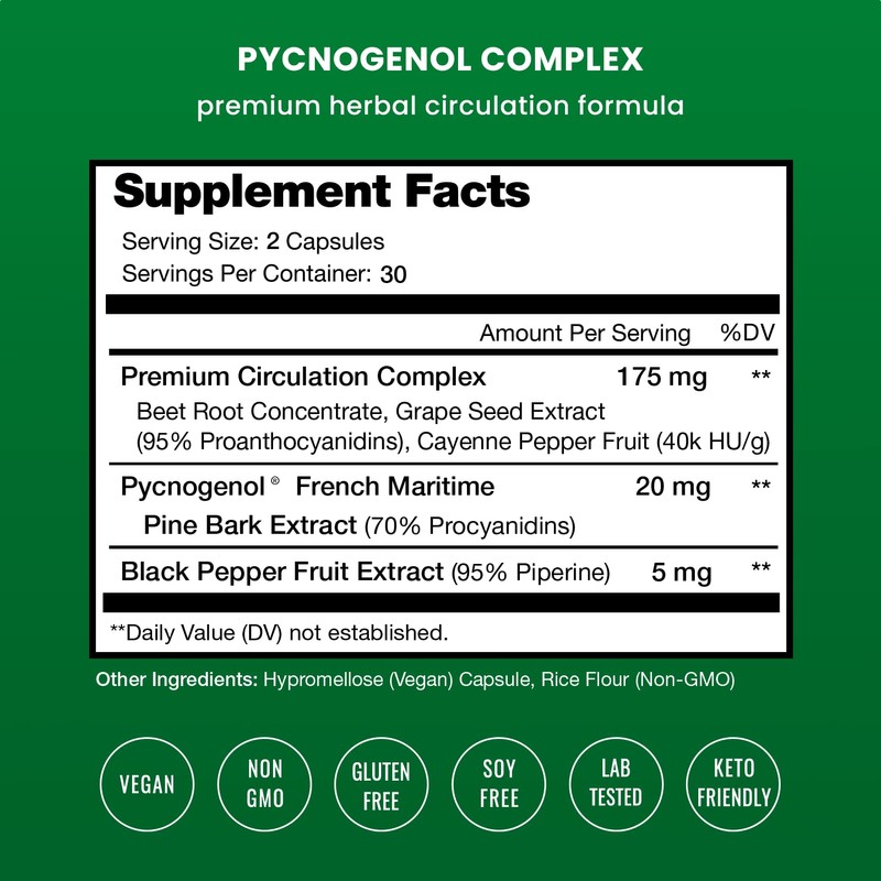 • Premium Patented Pine Bark Extract - Our Pycnogenol capsules come loaded with additional circulation stars beet root concentrate, cayenne pepper and grape seed extract. All of these ingredients have been clinically shown to improve blood flow, keeping you going longer and harder when you need it most.