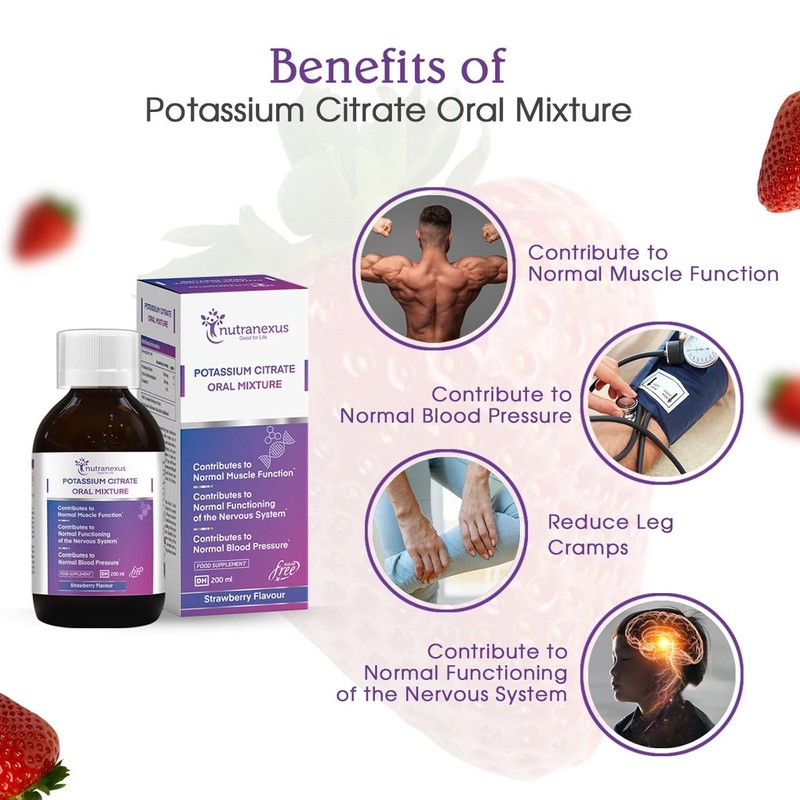 Nutranexus Potassium Citrate Oral Mixture - 200ml | Strawberry Flavor | Contributes to Normal Muscle Function, Nervous Function & Blood Pressure
