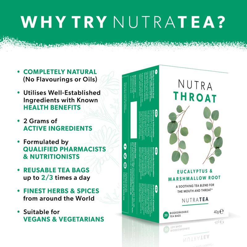 NUTRATHROAT - Throat Tea | Throat Comfort Tea - For Sore Throat & Coughs - Includes Marshmallow Root, Slippery Elm and Fenugreek - 20 Enveloped Tea Bags - by Nutra Tea - Herbal Tea