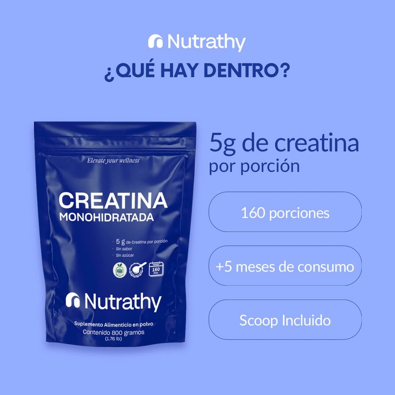 Nutrathy Creatina Monohidrata 800g. Completamente Pura, Sugar Free, Gluten Free, 5g de Creatina por porción, 160 días de Consumo, Scoop Incluído, Bottle Free.