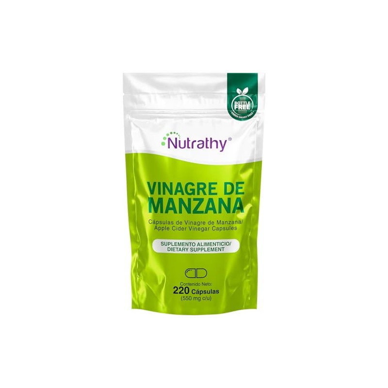 Nutrathy Vinagre de Manzana Premium 220 Cápsulas 100% Natural. 550mg. 110 Porciones por Envase, Bottle Free, Vcaps Cápsulas Veganas, Sugar Free.