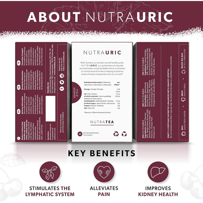 NUTRAURIC - Uric Acid Support - Containing Natural Cherry & Nettle - 20 Enveloped Tea Bags - by Nutra Tea - Herbal Tea