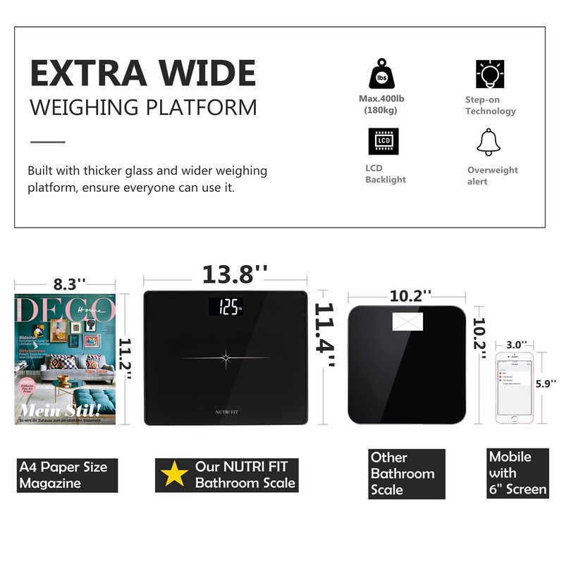 NUTRI FIT Extra-Wide/Ultra-Thick Digital Body Weight Bathroom Scale with 3 Inch Large Easy Read Backlit LCD Display Max Capacity 400lb Step-on Technology, Black