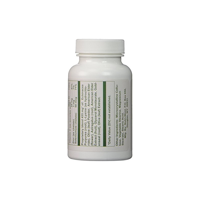 Each Tablet Contains: Vitamin A (as palmitate) (40% as Beta Carotene) 1250 mcg, Vitamin C (as ascorbic acid) 25 mg, Zinc (as chelate) 1 mg, Selenium (as chelate) 50 mcg. Proprietary blend 455 mg* of: Echinacea Purpurea (root), L-Lysine (as hydrochloride), Olive (leaf) Powder, Elderberry (flower), Astragalus (root), Elderberry Extract (sambucus nigra)(fruit), Glycerol Monolaurate, Olive (leaf) Extract.
