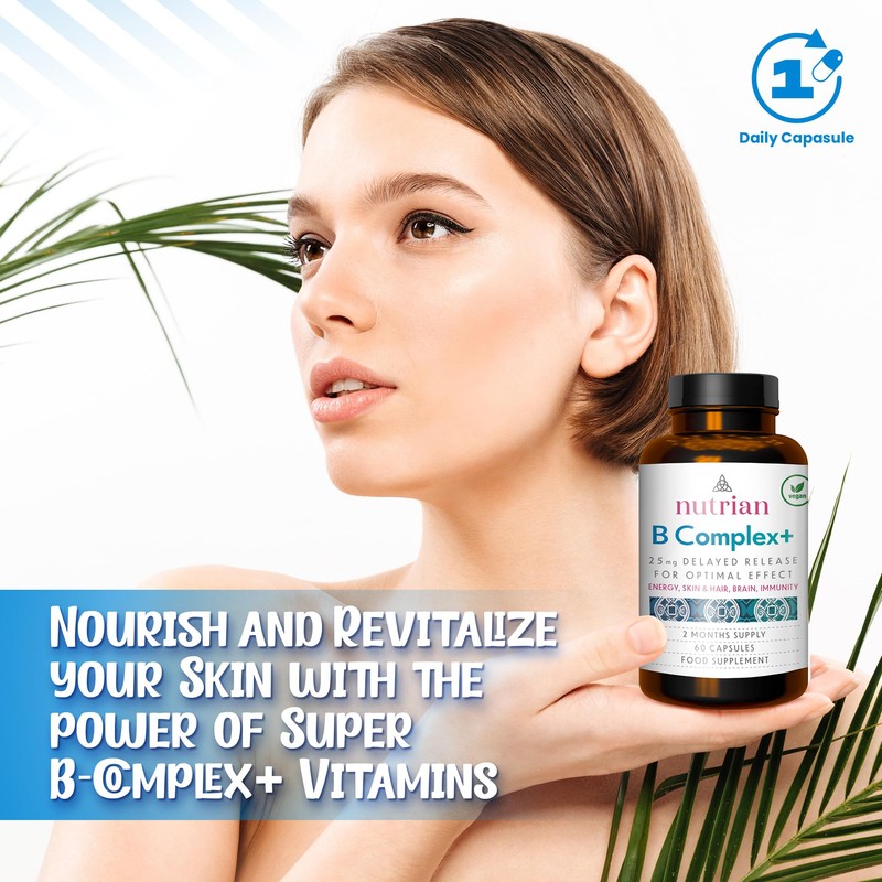 Why choose NUTRIAN B COMPLEX+? Our product stands out with its complete spectrum of essential B vitamins, carefully balanced to provide full support for both body and mind. The inclusion of Vitamin B1 and B5 aids in converting food into energy, helping you stay energized and fend off those midday slumps. Our formula also features Vitamin B6 and B12, which are vital for maintaining cognitive health. They help regulate mood, sharpen mental clarity, and reduce fatigue, ensuring you remain focused and positive throughout the day. For a radiant appearance, Vitamins B2 and Biotin work together to support healthy skin and strong hair, giving you a natural glow from the inside out. Immune support is another key benefit of NUTRIAN B COMPLEX+. With the addition of B12 Vitamin and Folate, this blend strengthens your immune system, helping you stay resilient and healthy. Our delayed-release formula ensures that the nutrients are gradually released into your bloodstream for optimal absorption. Enhanced with Inositol and PABA, the effectiveness of the B vitamins is further boosted. We provide each vitamin at effective doses that meet or exceed daily recommendations, and our formula is free from animal products, artificial additives, and unnecessary fillers. Additionally, NUTRIAN B COMPLEX+ includes Choline for enhanced brain health, Inositol for supporting cell membrane health, PABA for improved metabolic processes, and Folate in its most bioavailable form for superior absorption and cell repair. By choosing NUTRIAN B COMPLEX+, you're investing in a top-quality, vegan-friendly supplement that offers all-around support for energy, cognitive function, skin health, hair strength, and immune resilience. Elevate your wellness with a supplement that truly supports your health and vitality.