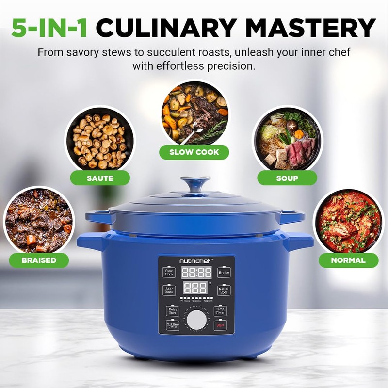 - VERSATILE 5-IN-1 COOKING - Seamlessly transition between sauting, searing, braising, slow cooking, and manual settings. The removable enameled cast-iron Dutch oven with lid and stainless steel knob delivers a traditional casserole pot cooking style.