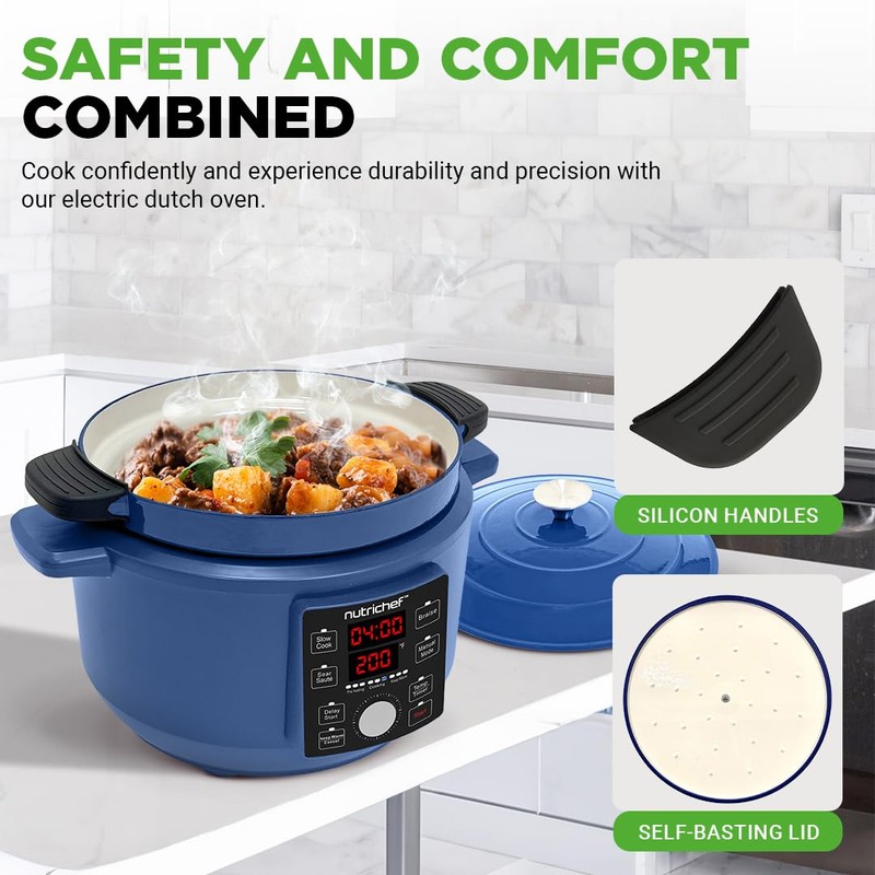 - PRECISION TEMPERATURE CONTROL - Experience optimal cooking with our electric 6-quart Dutch oven. The lid retains high temperatures, & integrated side carry handles make it safe for carrying even when hot.
