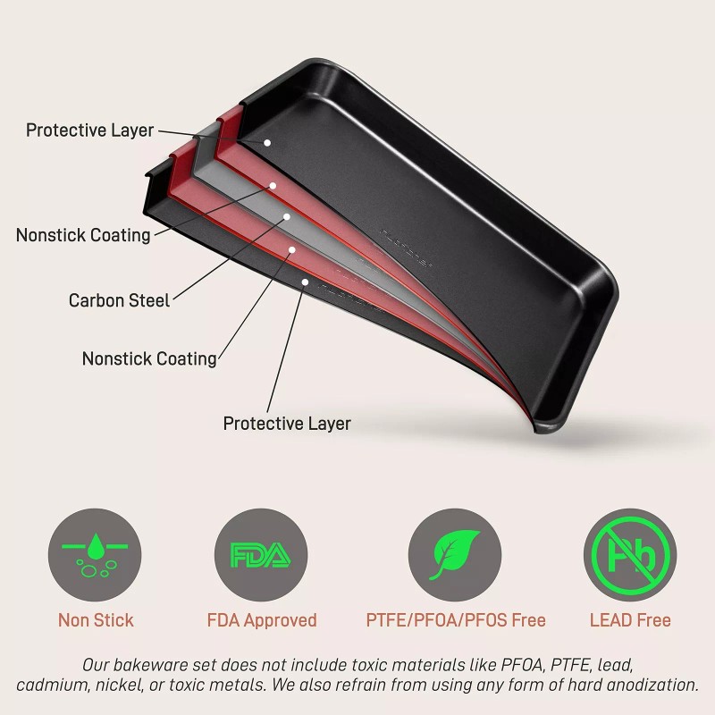 - NON-STICK COATED LAYER SURFACE: The baking pans set multi-layered nonstick coating helps ensure quick, effortless food release. Requires a minimal amount of butter, oil, or cooking spray. Delicious homemade baked goods slide out in one smooth slide