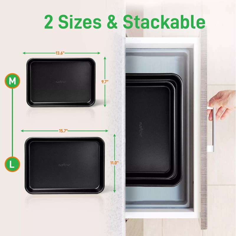 - 2 PIECE SET: The set includes 1 large baking sheet (LxWxH) 15.7" x 11.0" x 1.3" and 1 baking sheet medium size (LxWxH) 13.4" x 9.6" x 1.3" so you can make bulk batches of oven-baked cookies. Safe for kitchen ovens, convection ovens, toaster ovens