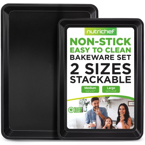 NutriChef Baking Sheet Pan Set, Non-Stick Cookie Sheets for Oven, 2-Piece Premium Large & Medium Size Baking Trays, Stackable & Durable, Black - NC2TRBL.5