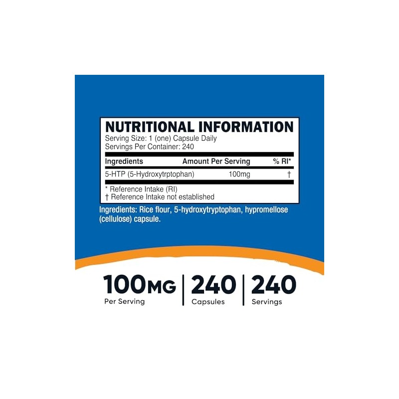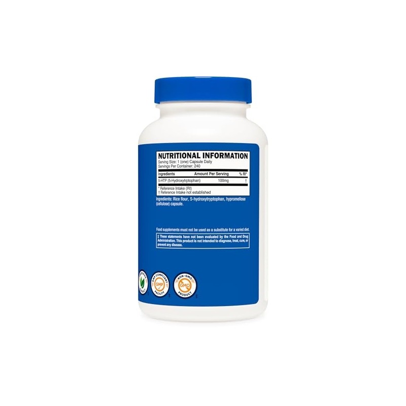 Nutricost 5-Hydroxytryptophan (also known as 5-HTP) contains 100 MG of potent, high-quality 5-HTP in each capsule. These pills are non-GMO and gluten-free.