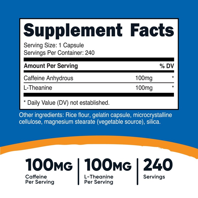 Product DescriptionNutricost Caffeine with L-Theanine, 100mg of Each, 240 Capsules, 240 Servings - Non-GMO and Gluten FreeIndicationsCaffeine + L-Theanine SupplementIngredientsCaffeine Anhydrous, L-Theanine, Rice flour, Gelatin capsule, Microcrystalline cellulose, Magnesium stearate (vegetable source), Silica.DirectionsAs a dietary supplement, take 1 capsule daily with 8-12 oz of water or as directed by your healthcare professional. The recommended dose of this product contains as much caffeine as about 1 cup of coffee. Do not consume more than 400 mg of caffeine from any source in a 24 hour period. Too much caffeine may cause nervousness, irritability, sleeplessness, and occasional rapid heart rates. In case of accidental overdose, seek professional assistance or contact a poison control center immediately.Safety WarningFood supplements should not be used as substitutes for a varied diet. Do not exceed the recommended daily dose.Legal DisclaimerThese statements have not been evaluated by the Food and Drug Administration. This product is not intended to diagnose, treat, cure or prevent any disease.Manufacturer Contact InformationImported Brands International Ltd., 124 City Road, London, EC1V 2NX, UK