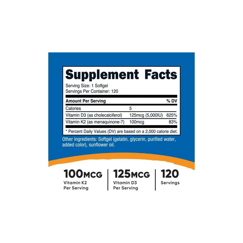 Nutricost Vitamina K2 + Vitamina D3, 120 Cápsulas Blandas Sabor Sin sabor