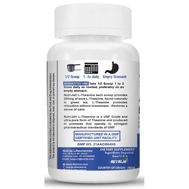 NUTRIJA L-Theanine powder is in the pure form & free of any fillers & additives thus you get 100% content of L-Theanine. Theanine promotes relaxation, rejuvenation, and focus. Multiple studies have shown that theanine supports focus and concentration without the intense jitters you would commonly have after having an energy drink. Theanine exerts its efforts on several fronts, by supporting levels of inhibitory neurotransmitters in the brain and promoting a state of relaxation in the brain and restore a sense of calm. For example, L-theanine supports levels of GABA in the brain to promote a relaxed sensation, also the effects of theanine is believed to have a big impact on alpha brain wave activity, which is believed to help with an alert, and relaxed state of mind. L-Theanine powder helps promote a restful sleep, relaxed state while maintaining daytime alertness. L-Theanine helps promote a healthy mood. Best Brain Health Supplement for Natural Relaxation, Restoration and Relief of Stress. NUTRIJA L-Theanine Powder is manufactured in USA based GMP certified facility in it’s purest form and derived from vegetarian source.