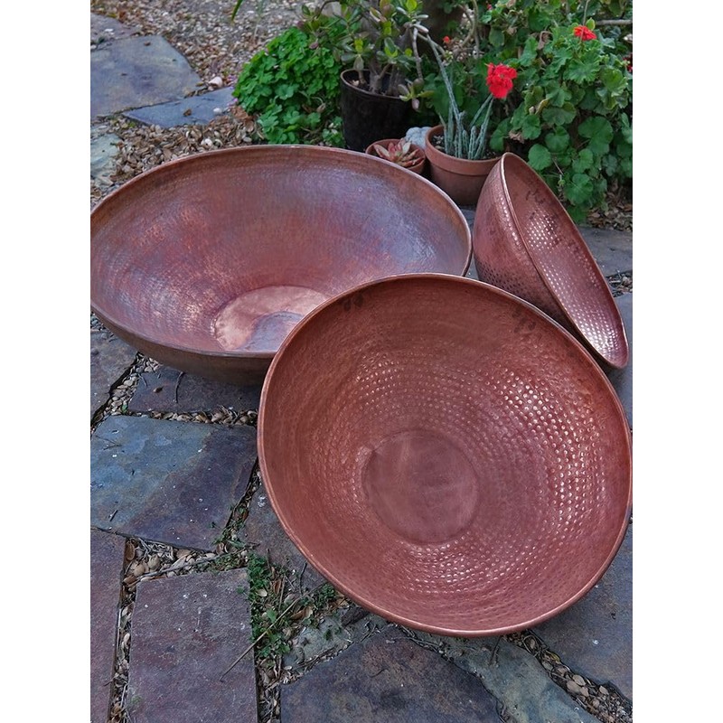 This is a gorgeous, unfinished basin in pure, hand-hammered copper, with a thick, rolled upper lip. Fill with pebbles or gravel and these will make an elegant accent as a catch basin for your rain chains. You can also use it as a planter or to build a fountain!