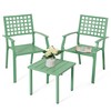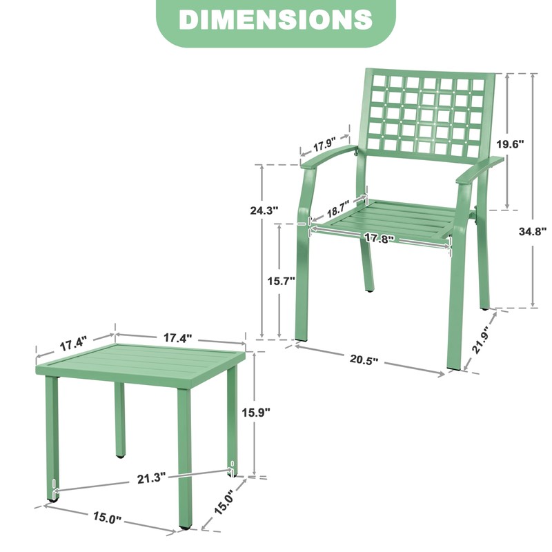 - STURDY AND DURABLE STRUCTURE: This 3 pieces small patio set features a powder-coated steel frame for strength and rust resistance. The square table and green patio chairs offer added stability outdoors