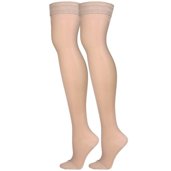 NuVein Sheer Compression Stockings for Women, 15-20 mmHg Support, 20 Denier, Thigh High, Closed Toe, Nude, Large
