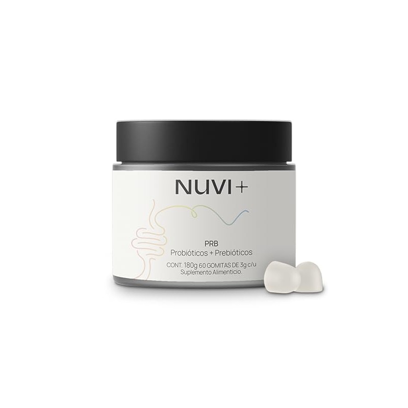 - Acerca de este artículo Suplemento alimenticio en forma de gomita 100% vegano y sin azúcar añadida, con colorantes y saborizantes 100% naturales, sin OMG (organismos modificados genéticamente), sin gluten y endulzado con fruto del monje Producto 100% mexicano. Las gomitas PRB de NUVI+ contienen probióticos que conviven con nuestra flora intestinal y ayudan a la correcta absorción de nutrientes, mejorando el sistema inmunitario, digestivo y el tracto intestinal; así como prebióticos los cuales son el "alimento" para las bacterias beneficiosas de nuestra flora intestinal. Ingredientes: Inulina de agave (fibra), fructo oligosacáridos (FOS), pectina hidratada, polidextrosa, ácido cítrico, fruto del moje, cera de carnauba, sabor mora azul, color blanco, cloruro de sodio. Suplemento: Inulina (fibra), Probióticos (Lactobacillus acidophilus). Las gomitas NUVI+ son fáciles de consumir y tienen un delicioso sabor, con lo cual será difícil que olvides tomar tus suplementos. Además, se descomponen con facilidad en el estómago, lo cual asegura una rápida absorción y una alta biodisponibilidad de los nutrientes. Dosis recomendadas