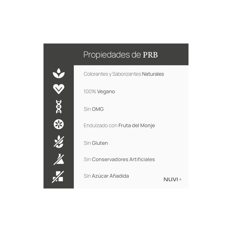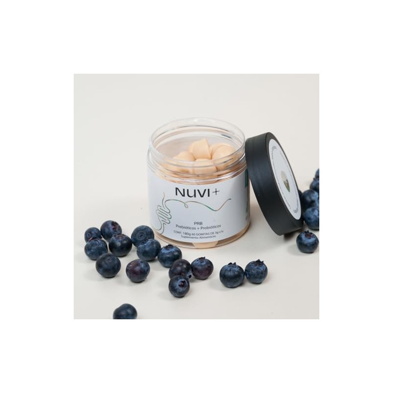 - Acerca de este artículo Suplemento alimenticio en forma de gomita 100% vegano y sin azúcar añadida, con colorantes y saborizantes 100% naturales, sin OMG (organismos modificados genéticamente), sin gluten y endulzado con fruto del monje Producto 100% mexicano. Las gomitas PRB de NUVI+ contienen probióticos que conviven con nuestra flora intestinal y ayudan a la correcta absorción de nutrientes, mejorando el sistema inmunitario, digestivo y el tracto intestinal; así como prebióticos los cuales son el "alimento" para las bacterias beneficiosas de nuestra flora intestinal. Ingredientes: Inulina de agave (fibra), fructo oligosacáridos (FOS), pectina hidratada, polidextrosa, ácido cítrico, fruto del moje, cera de carnauba, sabor mora azul, color blanco, cloruro de sodio. Suplemento: Inulina (fibra), Probióticos (Lactobacillus acidophilus). Las gomitas NUVI+ son fáciles de consumir y tienen un delicioso sabor, con lo cual será difícil que olvides tomar tus suplementos. Además, se descomponen con facilidad en el estómago, lo cual asegura una rápida absorción y una alta biodisponibilidad de los nutrientes. Dosis recomendadas