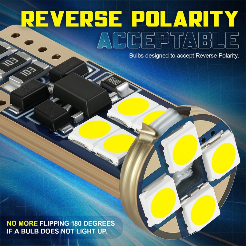 - 【Speciffications】194 (2B); 5500K Pure White LED Output; 12V Voltage; Lower Power Consumption than Halogen Counterparts, 1-6 Watt Usage Per Bulb; Bulbs designed to accept Reverse Polarity. No more flipping 180 degrees if a bulb does not Light Up