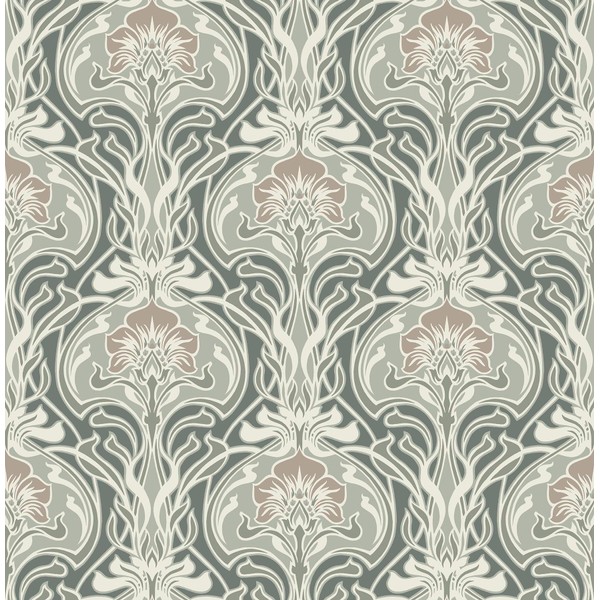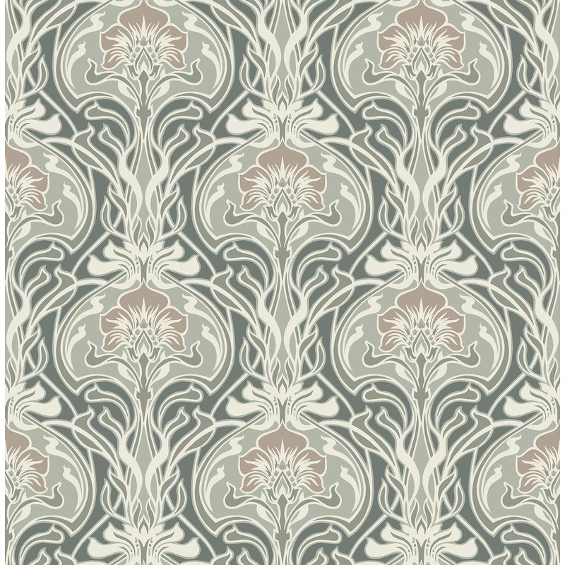 - Brown and taupe ogee peel and stick NuWallpaper with floral motif