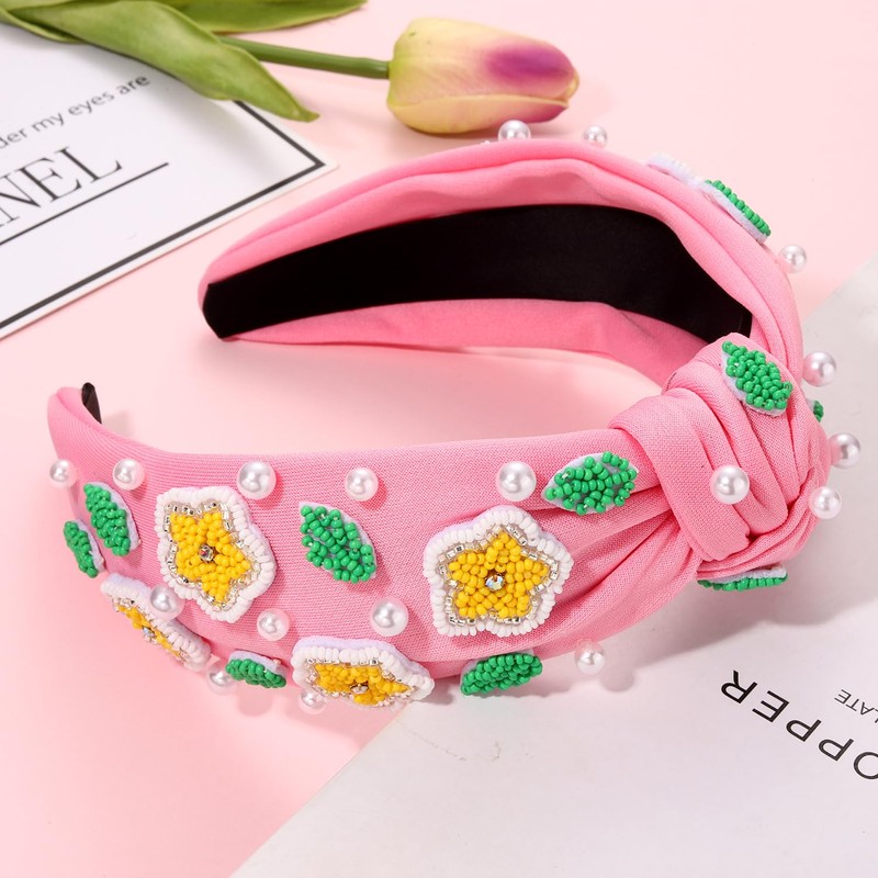 - ღ Crystal Knotted Headband: Enhance any summer look with this chic, delicate flower Jeweled Knot Headband. With its floral motif and crystal embellishments, this chic and intricate pink flower headband will be your new favorite summer accessories. They made of soft fabric, pearls, rhinestone and plastic, which is stretchable, the comfortable fit ensures that it stays in place all time. An essential for that weekend getaway to the coast or to level up your casual summer outfits