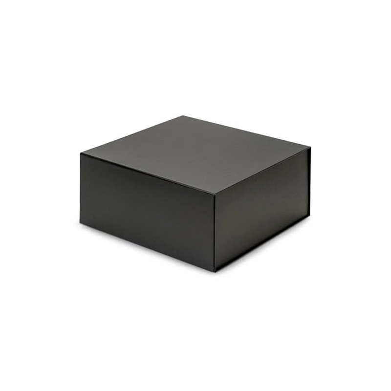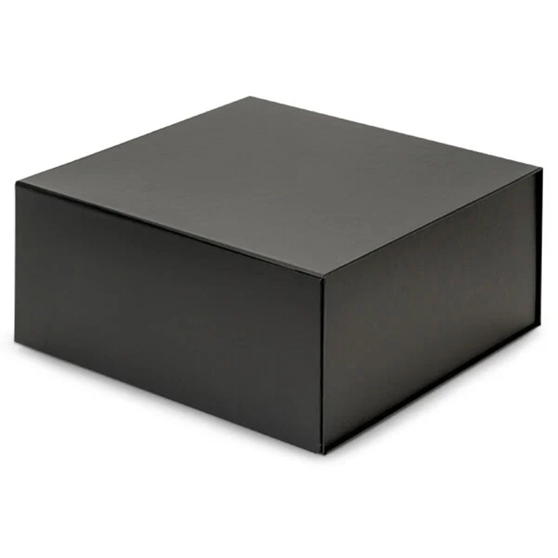 - These high quality, collapsible black gift boxes measure 10in. x 10in. x 4.5in. These Boxes are easy to assemble with strong magnets to secure the box closed. Boxes come with paper covered glue strips to make the box permanent. These rigid, magnetic gift boxes are an easy to use option for packaging gifts, wine, candies and gourmet foods.