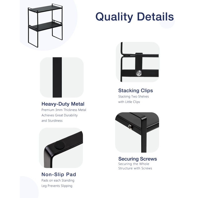 - STACKABLE: The product comes with two sets of cabinet shelves where you can stack one on top of another, creating 2-tiers double space to store household items under, in between or on the shelf. They are perfect to use as storage organizers in kitchen, cabinet, pantry, cupboard, and anywhere in your home or office for that wonderful extra storage space.