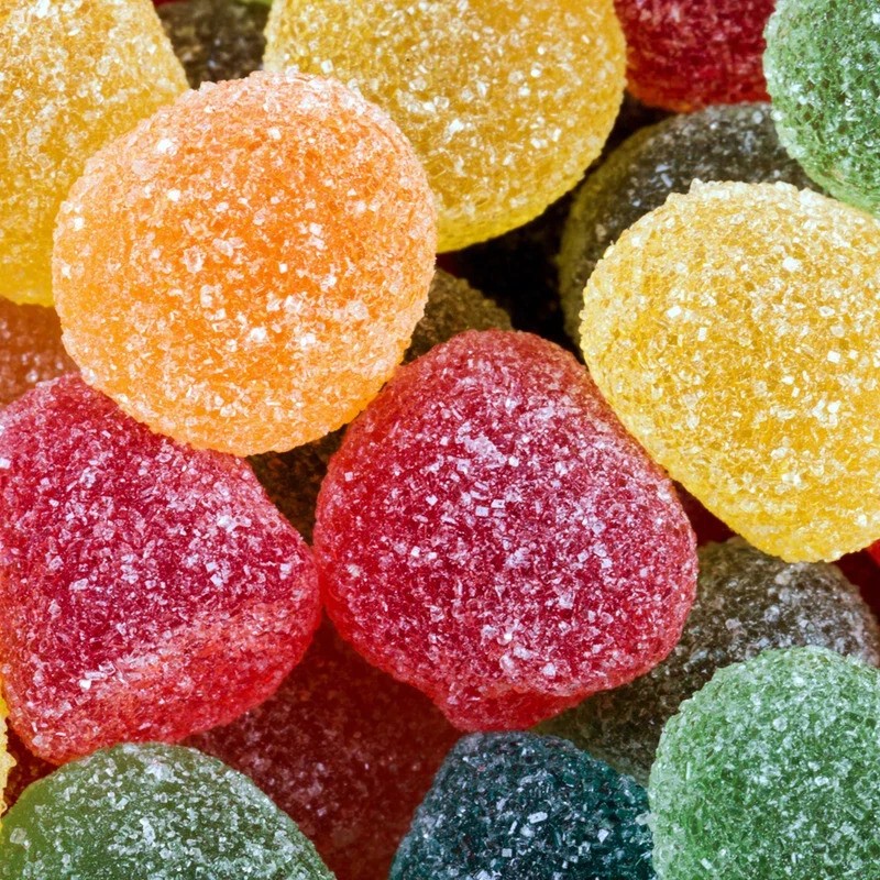 Big chunks of soft and fruity jelly candies shaped like raspberries. A sweet snack with a lovely texture with a deliciously refreshing fruity taste.