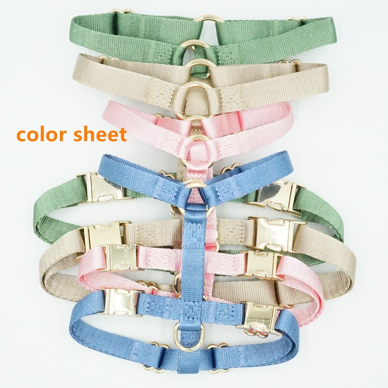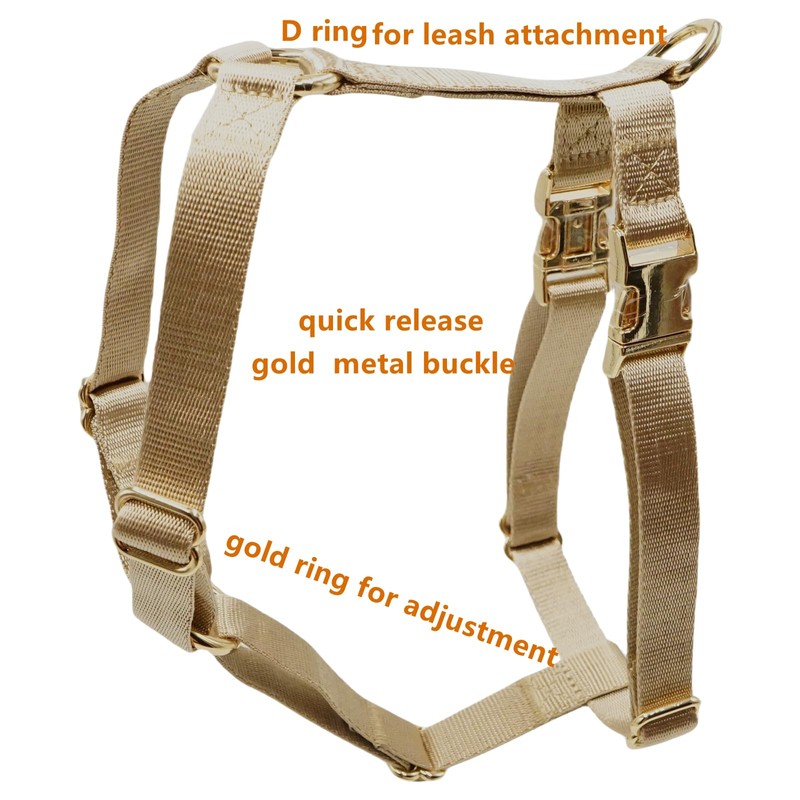 This nylon no-pull dog walking harness is designed to provide a comfortable and secure fit for your furry companion during walks and outdoor adventures. Crafted from durable nylon material, it offers strength and longevity, ensuring it can withstand the daily wear and tear of active dogs. The harness features gold metal buckles that not only add a touch of elegance but also ensure easy on and off for your convenience. With its no-pull design, it gently discourages pulling behavior, making walks more enjoyable for both you and your pet. The harness is adjustable to accommodate different dog sizes, ensuring a customized fit. Whether you're going for a leisurely stroll or an energetic hike, this nylon no-pull dog walking harness with gold metal buckles is a practical and stylish choice for keeping your canine friend safe and under control