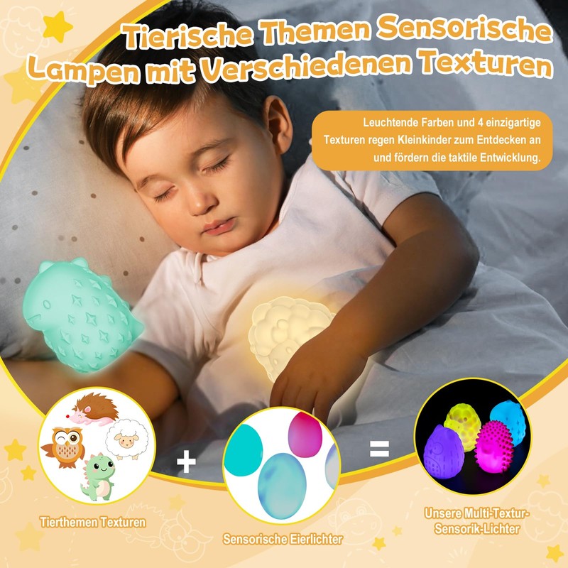 This NYOBABE sensory toy comes in four animal shapes and different textures, and each sensory light of the animal is equipped with a colour-changing light that offers children multiple tactile and visual experiences. These sensory lights can not only be used as a night light or room decoration, but also as a sensory toy for children with autism or ADHD. The size of the sensory light is very suitable for children's small hands, and it is very convenient to use, just turn on the switch at the bottom. These sensory toys are suitable for children of all ages and are ideal gifts for boys and girls.
